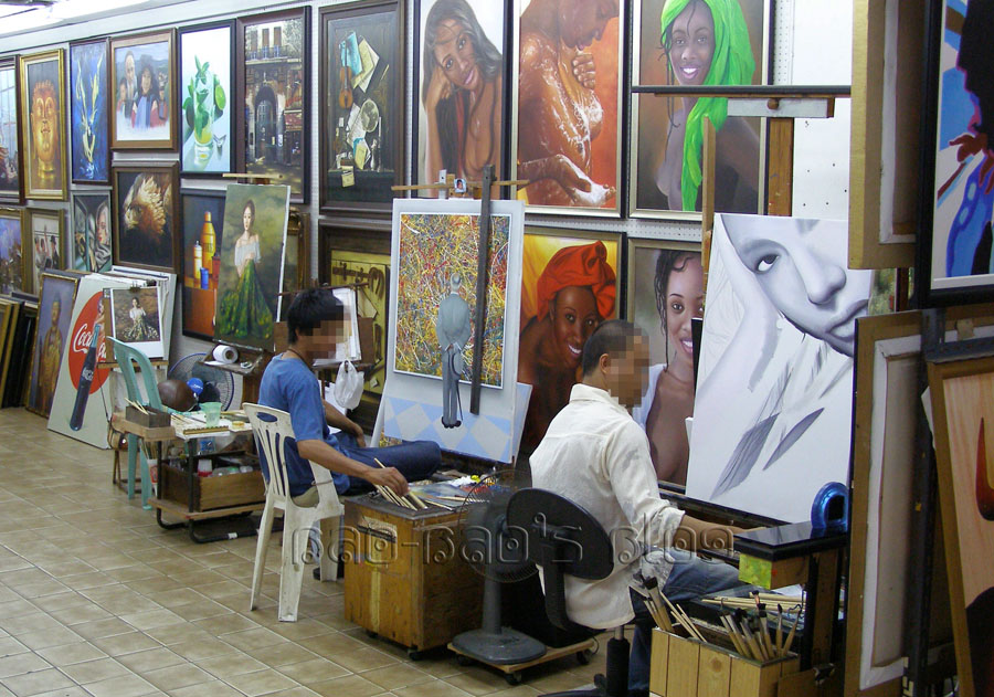 Take for example the shops who will, for a fee, paint you a piece of art from a photo you bring in. Some also have original pieces for sale, but usually they're copies of existing images: paintings, photographs, that sort of thing. The shop up top today was one where several people sit day after day, carefully painting canvas after canvas of reproductions such as the one of Vincent Van Gogh's painting of irises. You can see the image of his painting in the book clipped open to the right of the canvas.